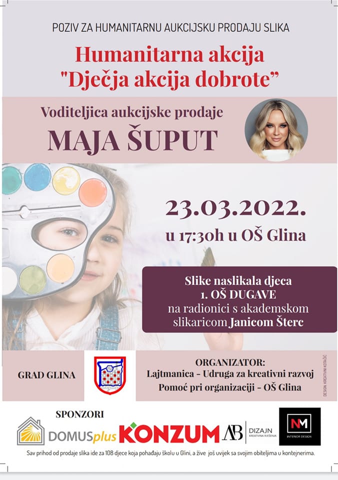 Voditeljica aukcijske prodaje bit će, ni manje ni više, Maja Šuput, a aukcija će se održati u srijedu, 23. ožujka, s početkom u 17:30 u OŠ Glina.
