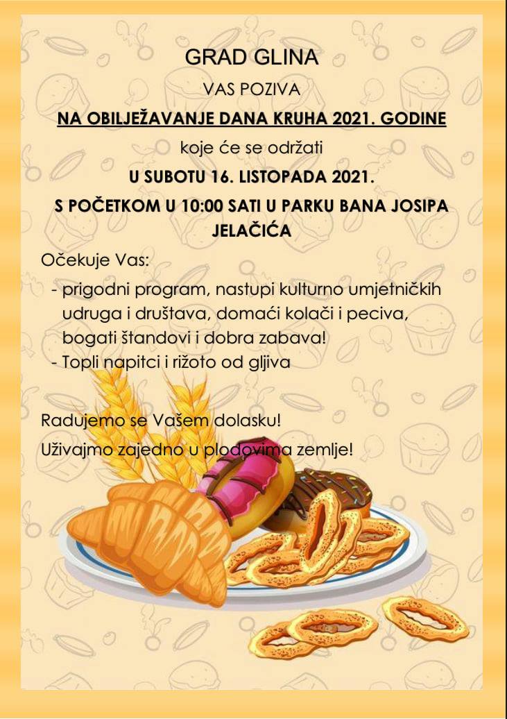 -Pozivamo Vas na obilježavanje Dana kruha 2021. koje će se održati u subotu 16. listopada s početkom u 10 sati u parku bana Josipa Jelačića, poručili su iz Grada putem svojih društvenih mreža.